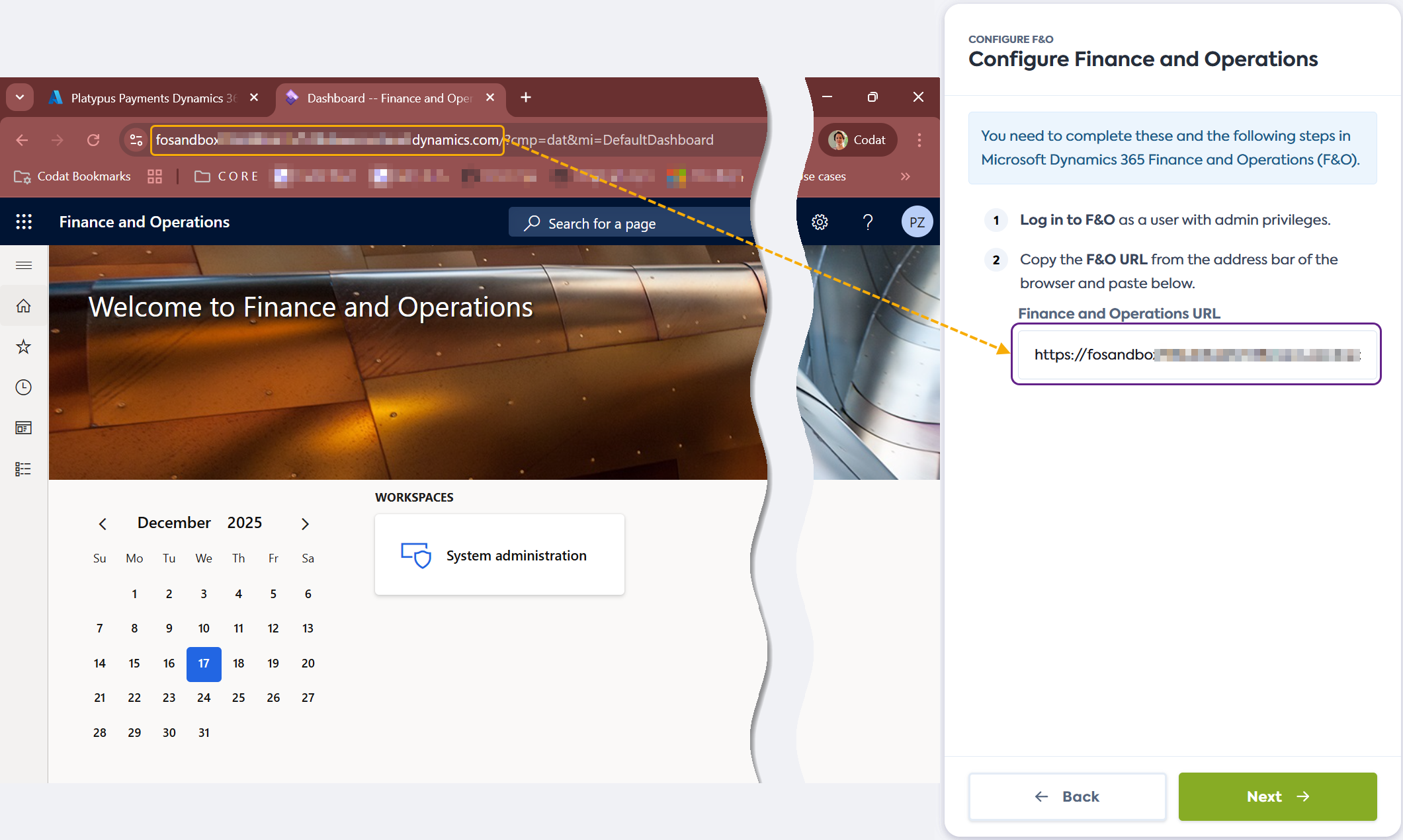 Connectez-vous à Dynamics 365 F&O en tant qu'utilisateur avec des privilèges d'administrateur. Copiez et collez l'URL de base de votre instance F&O dans le flux de connexion et cliquez sur Next.