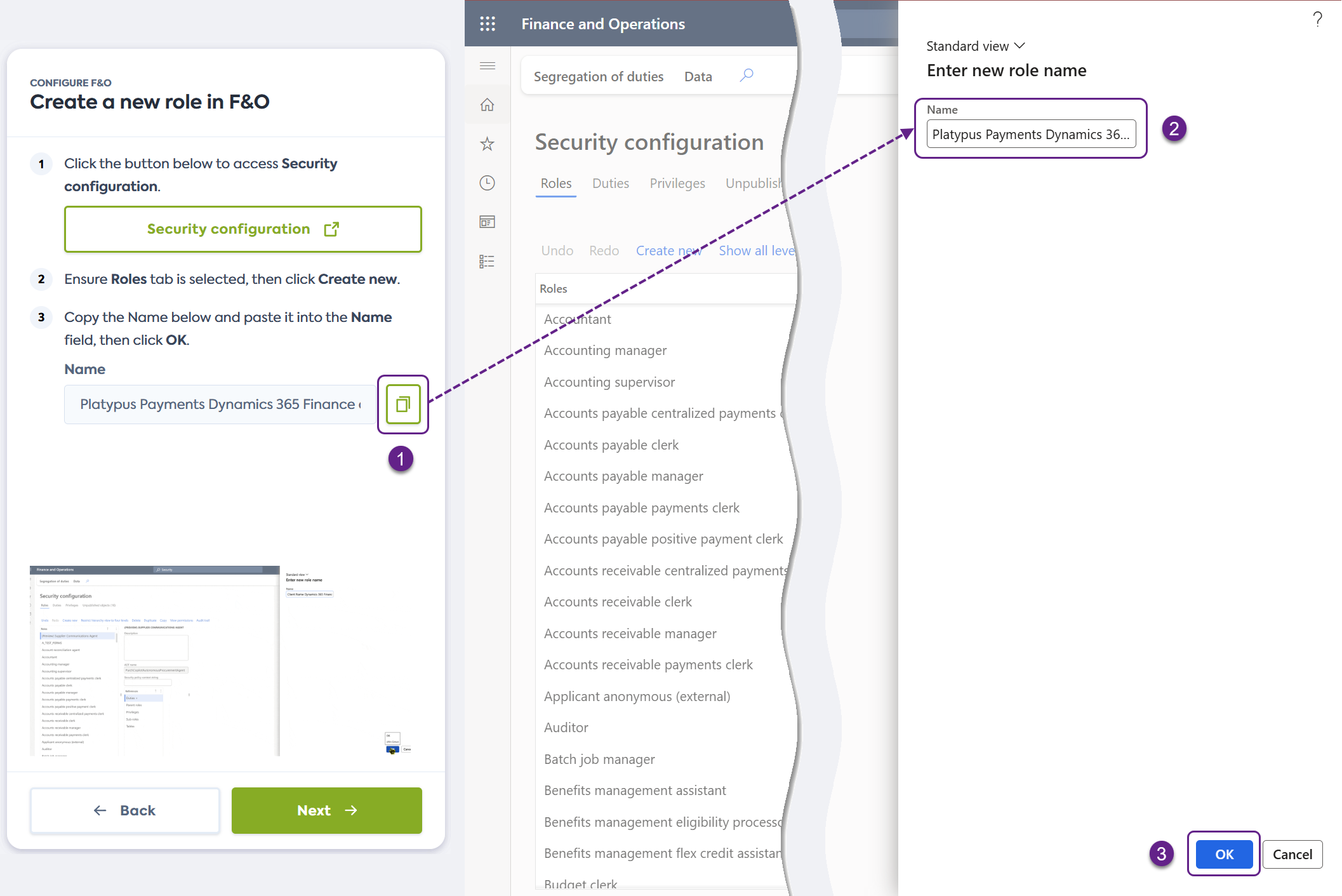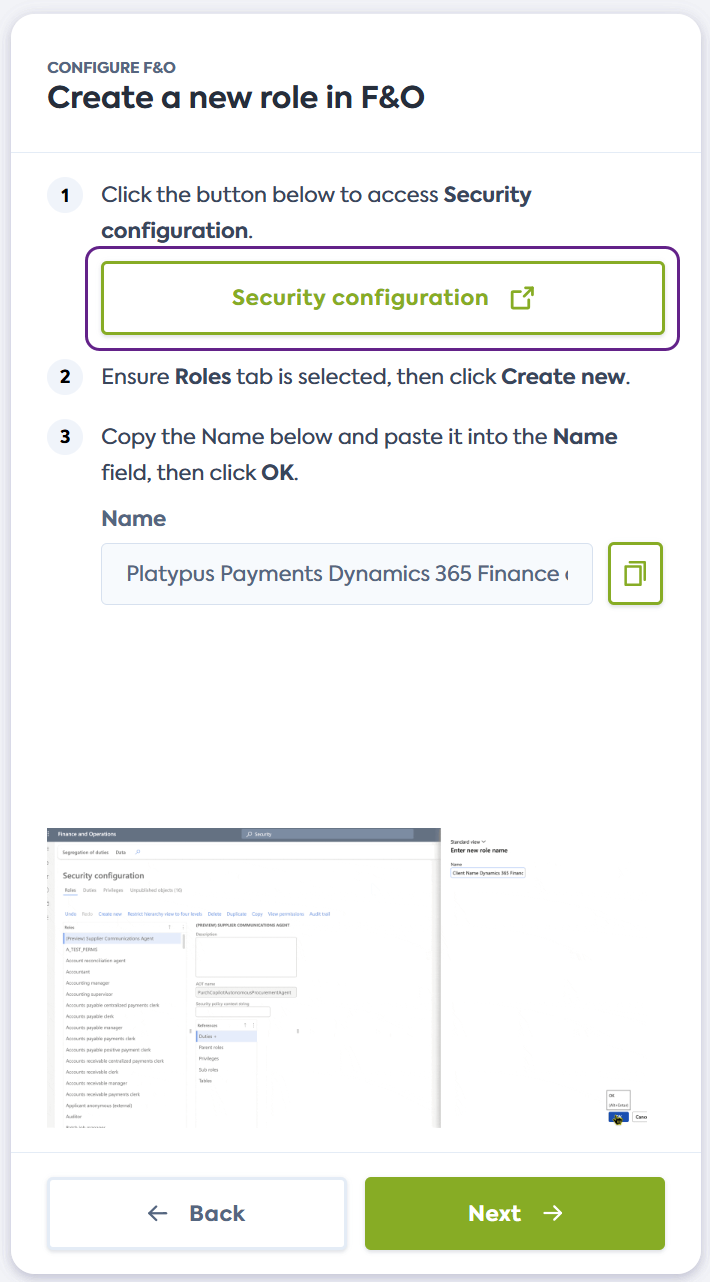 Sur l'écran Create a new role in F&O du flux de connexion, cliquez sur le lien fourni. Il ouvrira la page Security configuration de Dynamics F&O dans une nouvelle fenêtre.