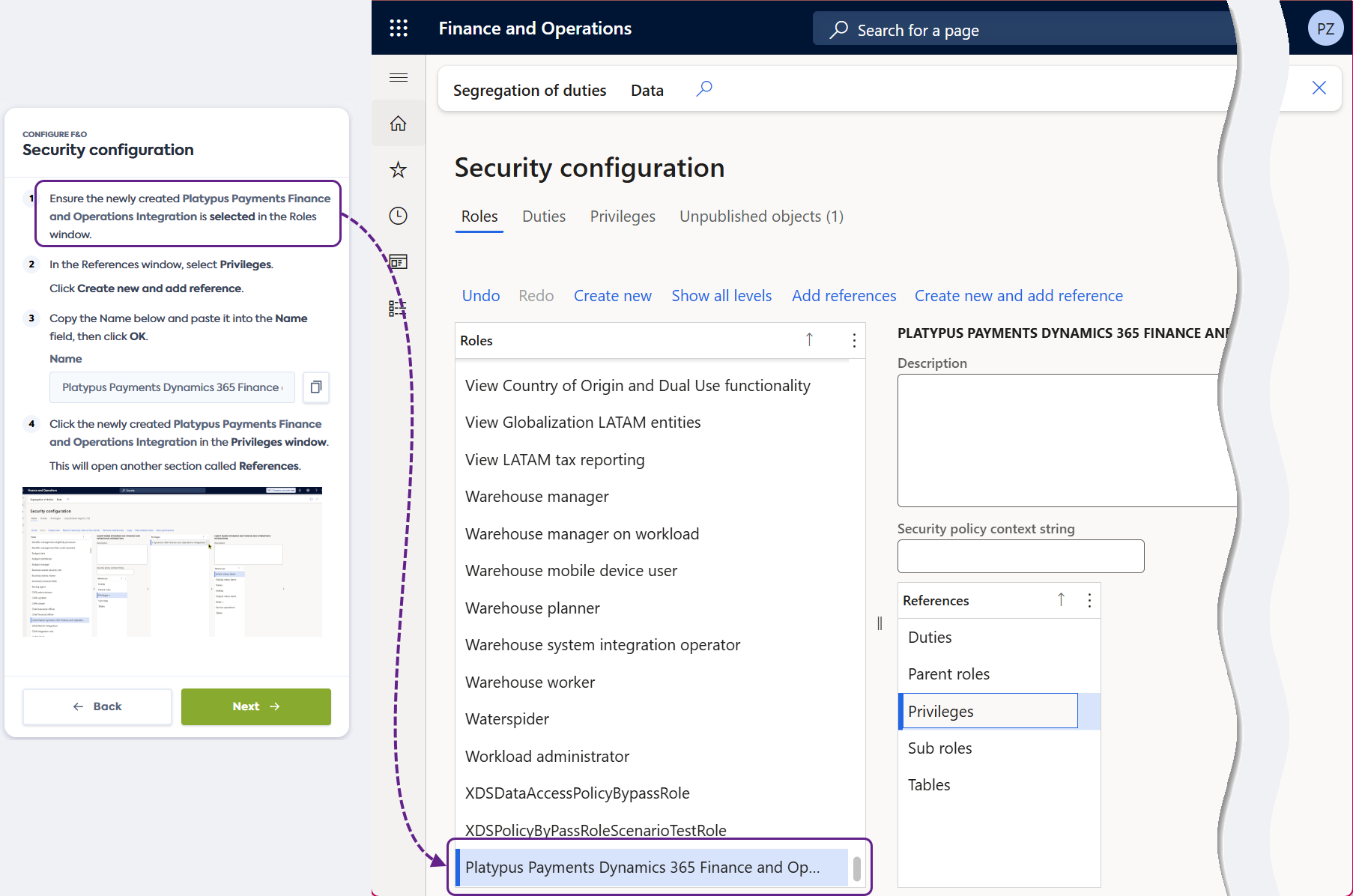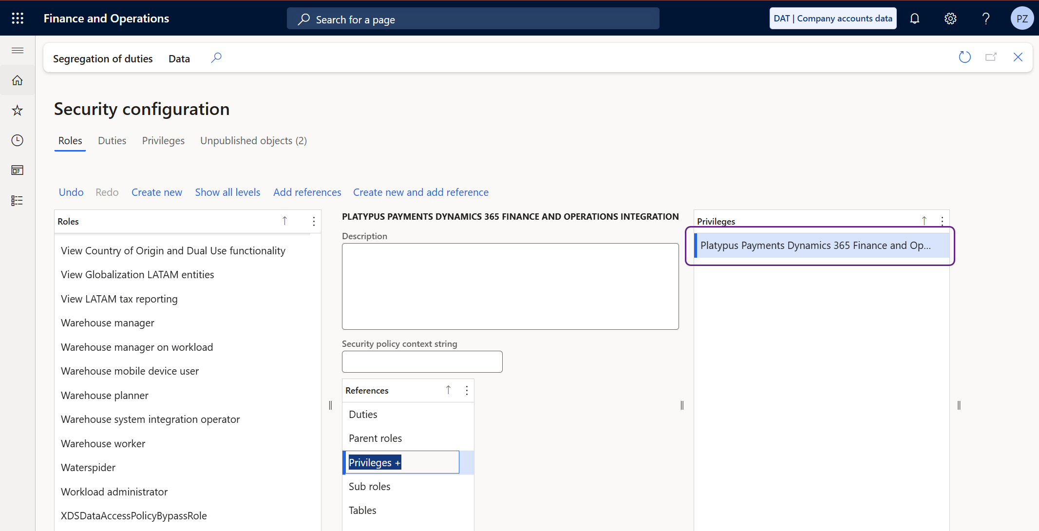 Dans la section References, sélectionnez Privileges. Cliquez sur Create new and add reference.