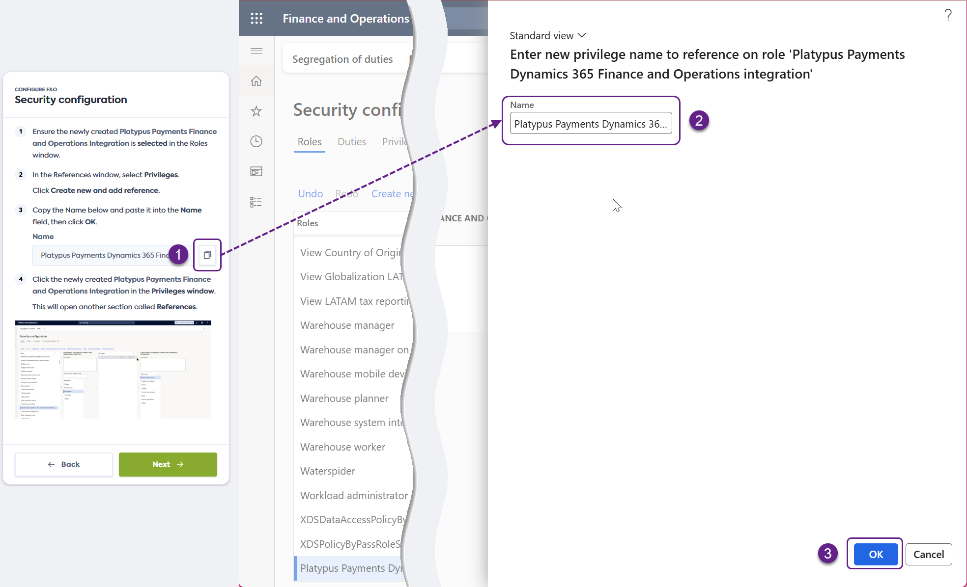 Copiez le nom fourni dans le flux de connexion et collez-le dans le champ Name de l'écran Security configuration, puis cliquez sur OK pour créer le privilège.
