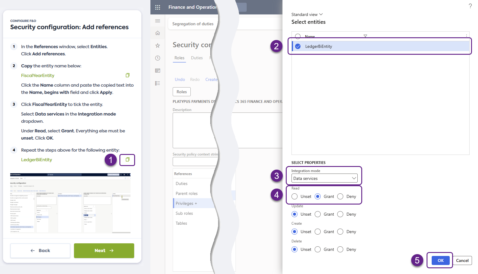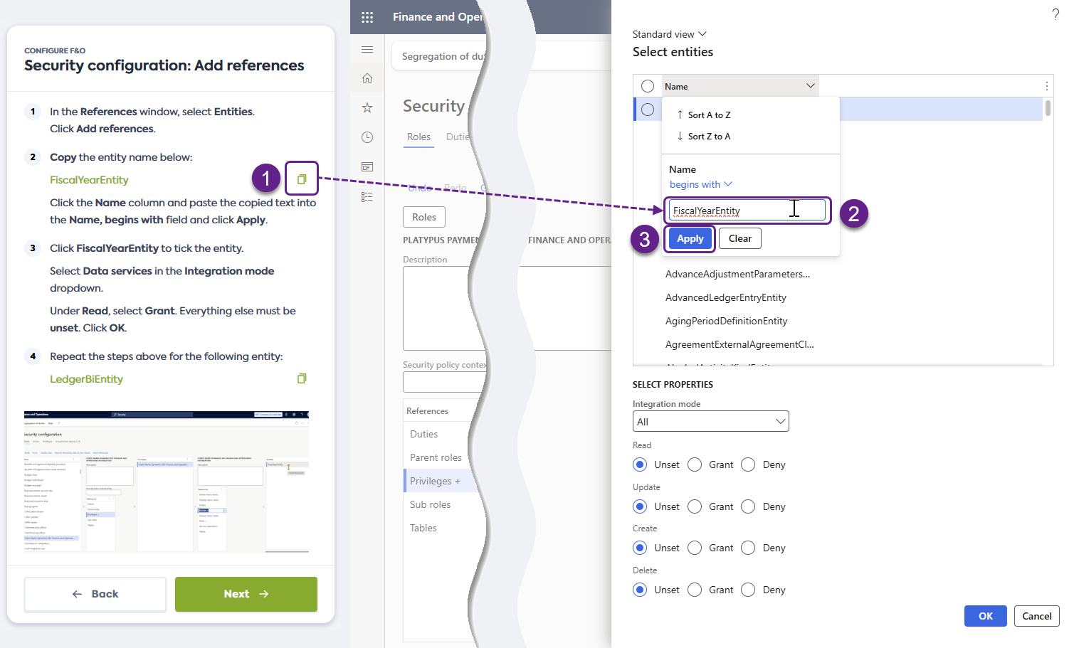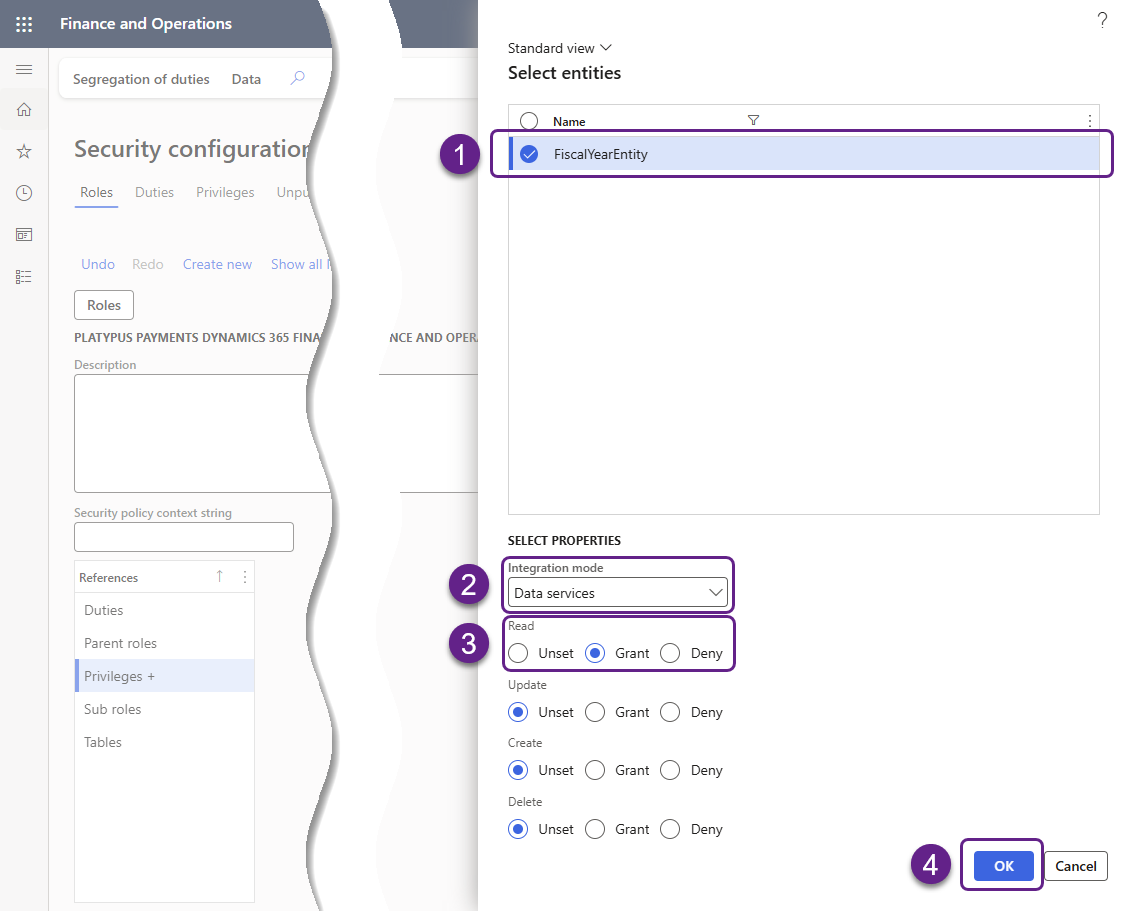 Cliquez sur FiscalYearEntity pour cocher l'entité. Dans la section Select properties, sélectionnez Data services dans le menu déroulant Integration mode. Sous Read, sélectionnez Grant.