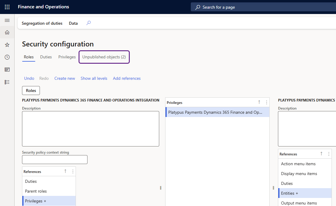 Dans l'onglet Unpublished objects, sélectionnez le rôle et le privilège que vous venez de créer.