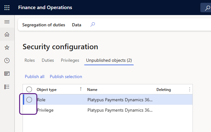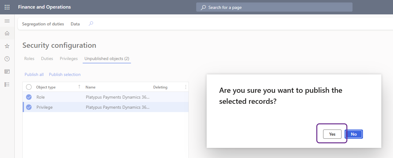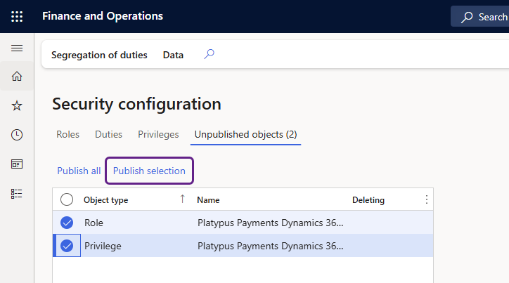 Ensuite, vous devez publier le rôle que vous avez créé et le privilège associé. Complétez les étapes suivantes dans Microsoft Dynamics 365 F&O :