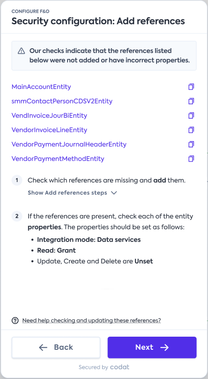 Si seulement certaines références sont manquantes ou ont des propriétés incorrectes, vous serez dirigé vers des étapes supplémentaires du flux de connexion. Ces étapes listeront les références d'entités spécifiques qui sont manquantes ou mal configurées et fourniront des instructions pour les ajouter ou corriger la configuration.